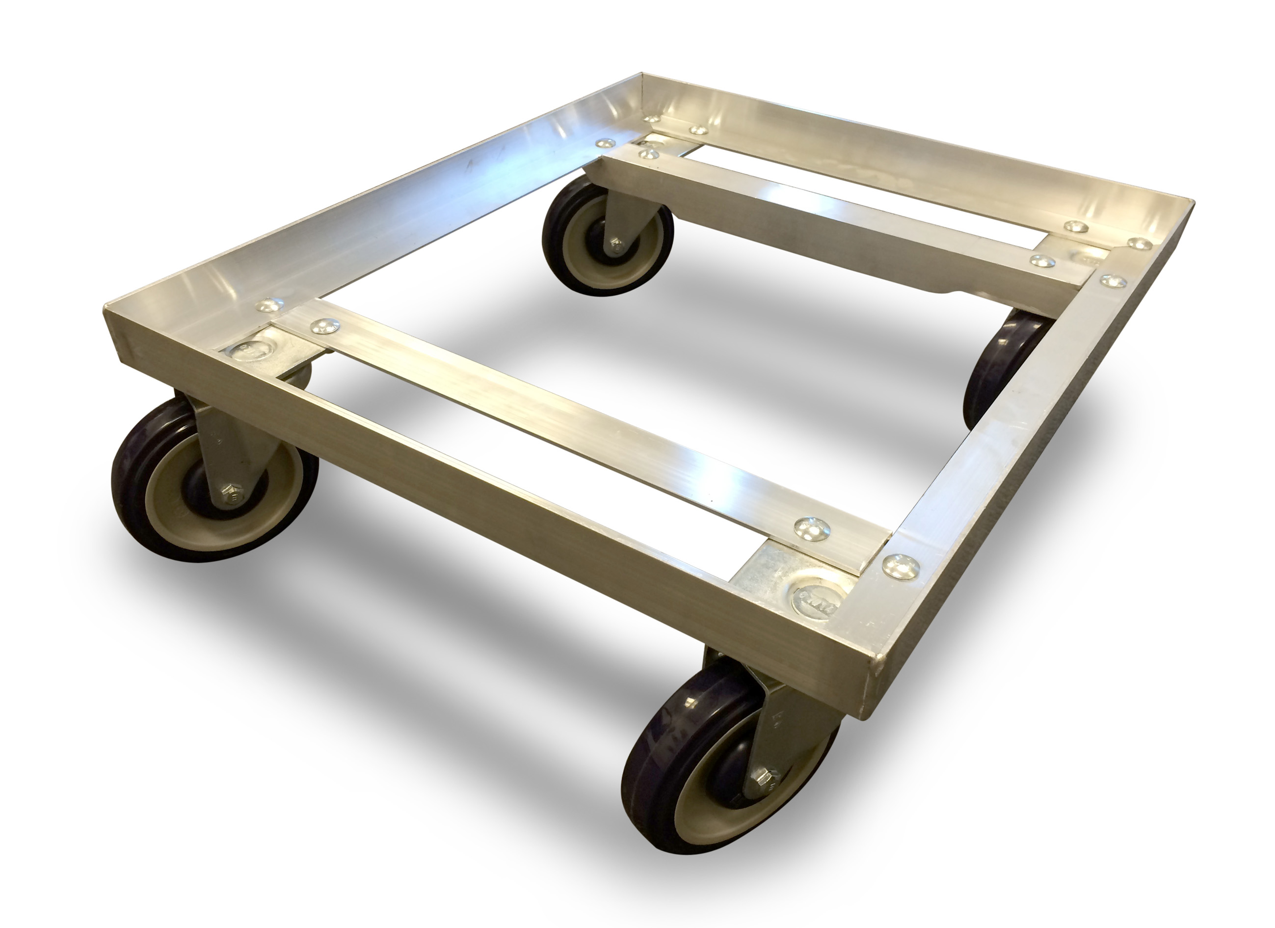 Aluminum dollies are a great solution for wet environments. They are also ideal if your need to replace casters or wheels over time, as the casters are bolted onto the strong aluminum angle frame. Caster replacement a breeze. Some of our customers have had the same aluminum dollies in use for over a decade. Our dollies are used is some of the harshest environments where washing is frequent and used in refrigeration, freezers and blast chillers on a daily basis.